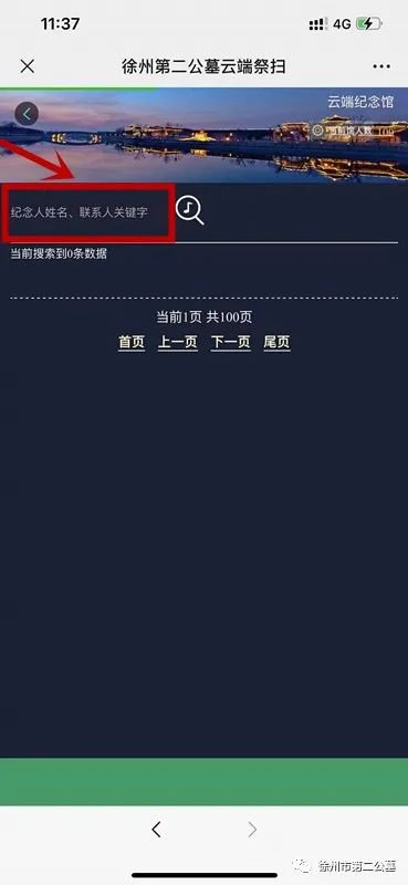 输入纪念人姓名(逝者姓名)、联系人关键字即可进行“云端祭扫”。