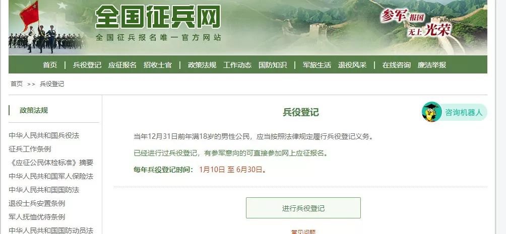 在这个页面中,会告知报名时间以及参军的政策说明,建议看后,点击“进行兵役登记”,迈出你军旅生涯的第一步吧!(★已经进行过兵役登记,有参军意向的可直接参加网上应征报名。)