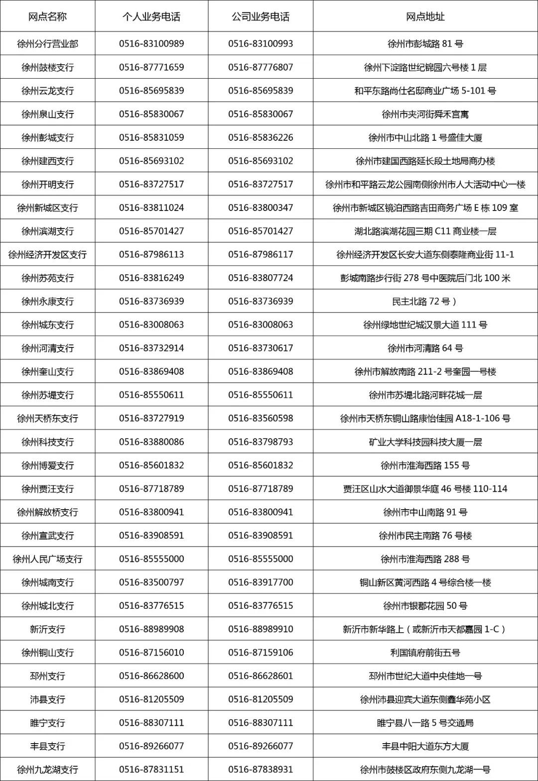 江苏银行徐州分行网点一览表