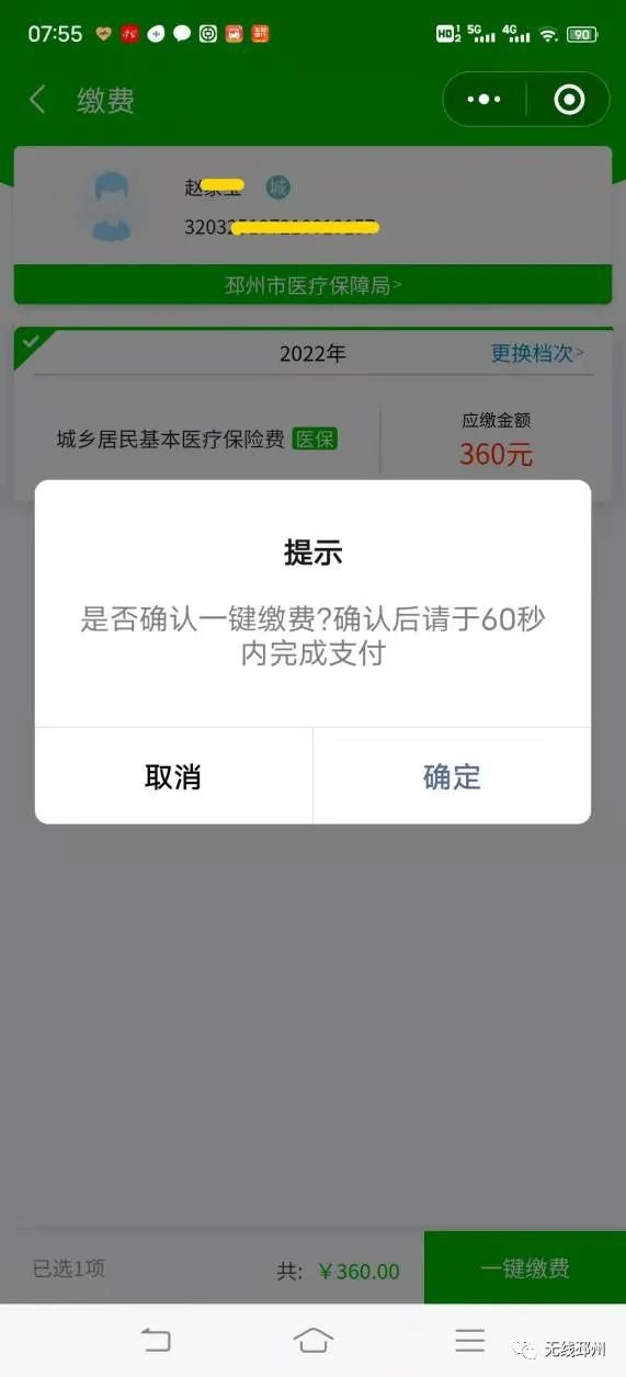 7.点击“一键缴费”进入支付环节,支付环节就是标准的微信支付过程(注意要在60秒内完成缴费)。
