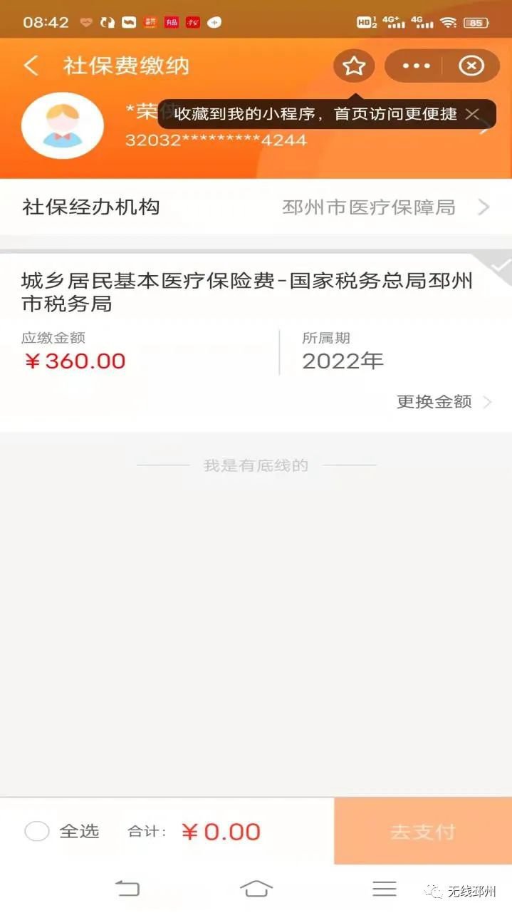 4.选择城乡居民基本医疗保险费→确认所属期“2022年”和应缴金额“360元”。(注意税务机关为“国家税务总局邳州市税务局”