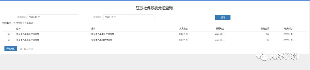 (5)选择需要打印的“缴费所属期”,点击“查询”,勾选需要打印的项目,点击“开始打印”,即可下载打印电子票据。