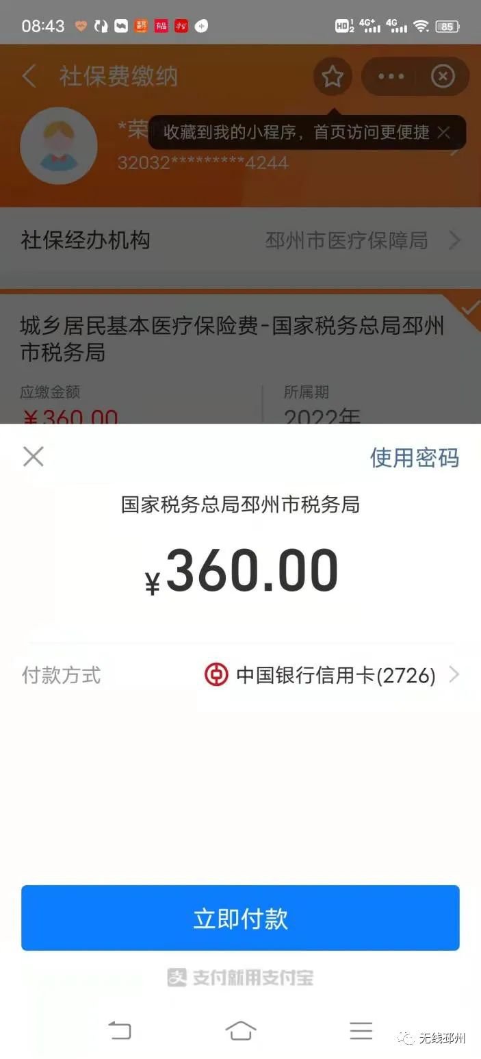 6.点击“缴费”或者“代人代缴”→选择缴费年度“2022年”缴费金额“360元”。