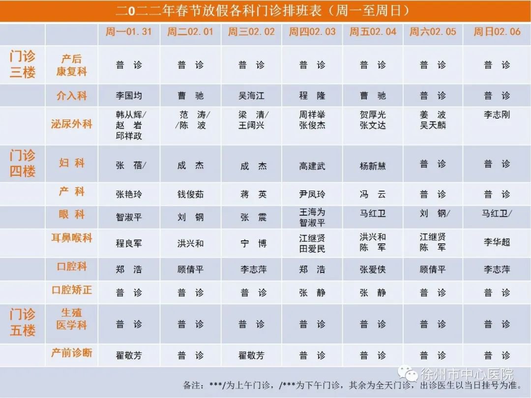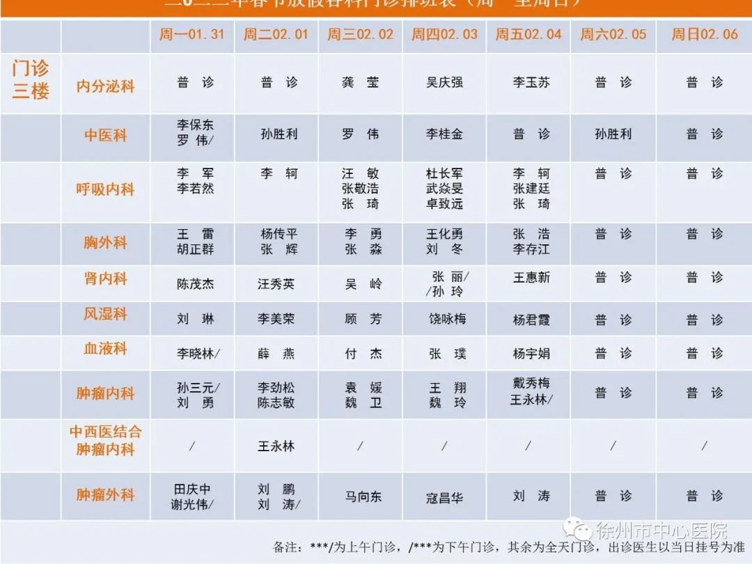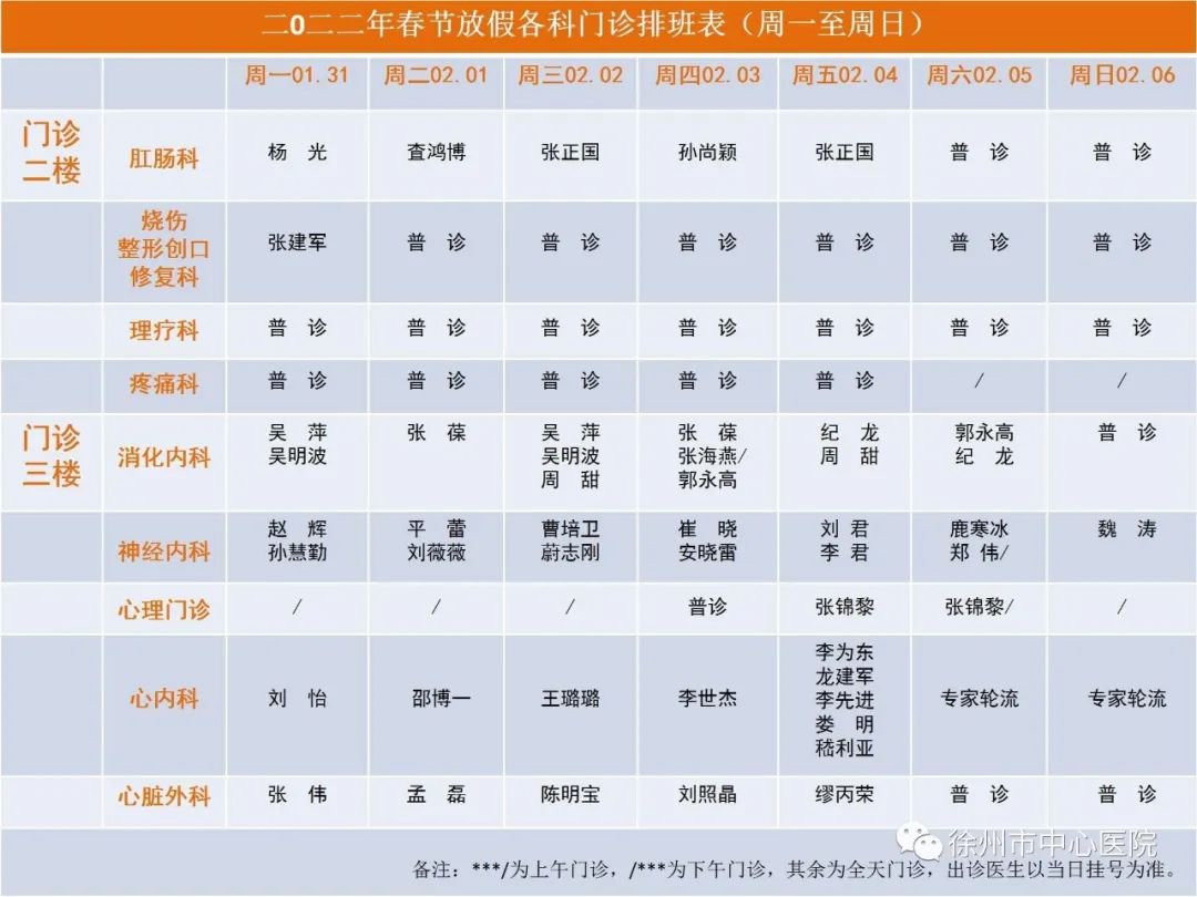 2022年春节徐州市中心医院门诊出诊时间表