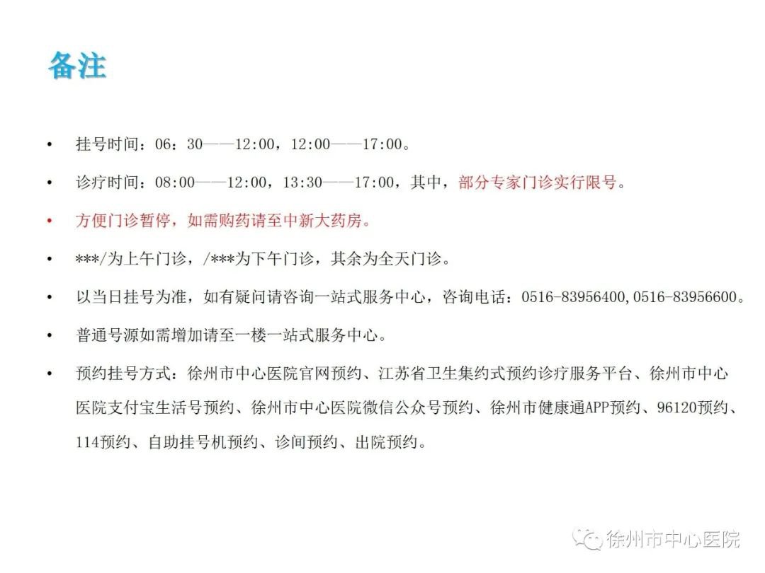 4、微信预约、支付宝预约、诊间预约、出院预约周期为跨月28天,省预约平台预约、市中心医院官网预约、徐州健康通预约、自助挂号机预约、电话预约周期为跨月7天。