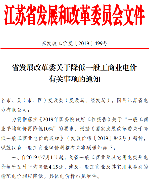 一、自2019年7月1日起,我省一般工商业及其它用电类别电价每千瓦时平均降低4.15分。涉及一般工商业及其它用电类别的输配电价相应降低。
