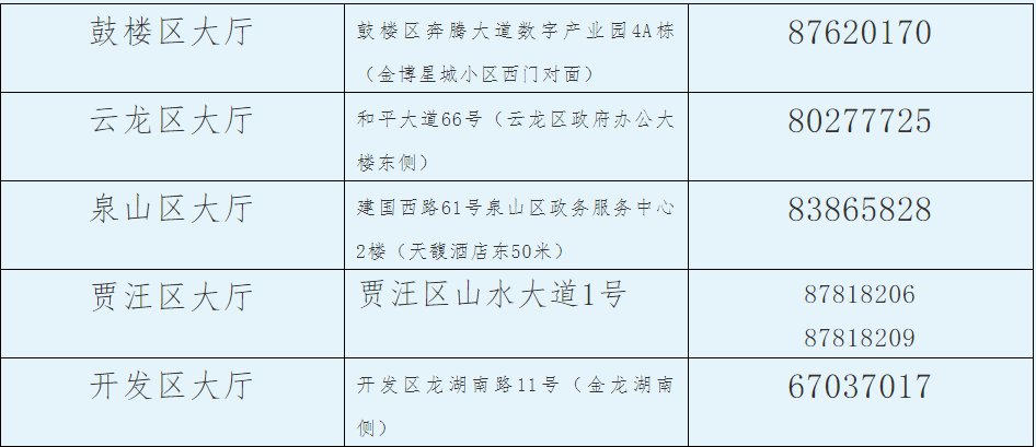 特别说明:贾汪区大厅办理全部个体业务(退费业务除外)。
