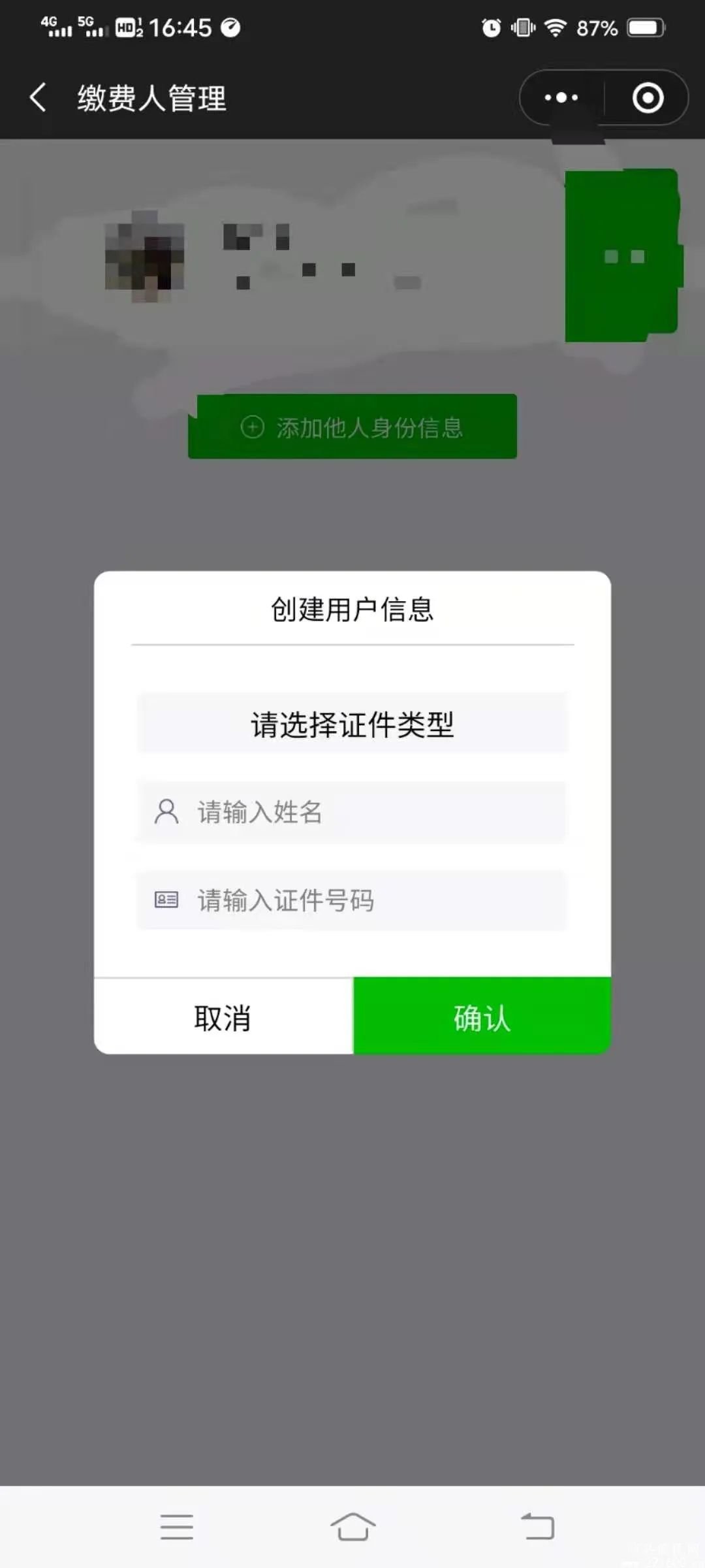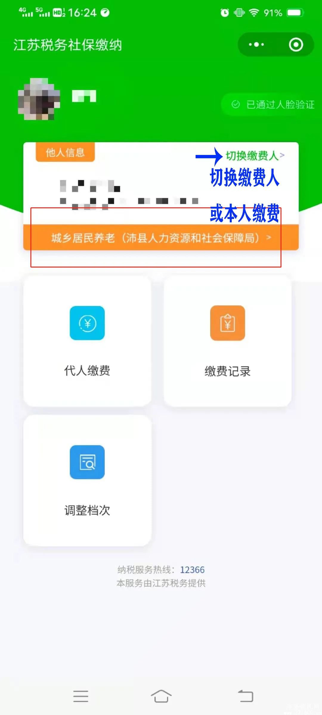 4.完成“实名认证”后,默认出现“本人”登记信息,点击“缴费”,可以为本人缴费。点击“切换缴费人”,“添加他人身份信息”可切换至他人身份,进而为他人缴费。