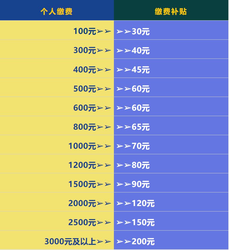 个人缴费标准目前设为每年100元、300元、至3000元及以上12个档次。其中100元的缴费档次,只适用于重度残疾人及建档立卡未标注脱贫的低收入户。最高缴费档次标准不超过当地灵活就业人员参加企业职工基本养老保险的年缴费额。财政补贴标准见下表。