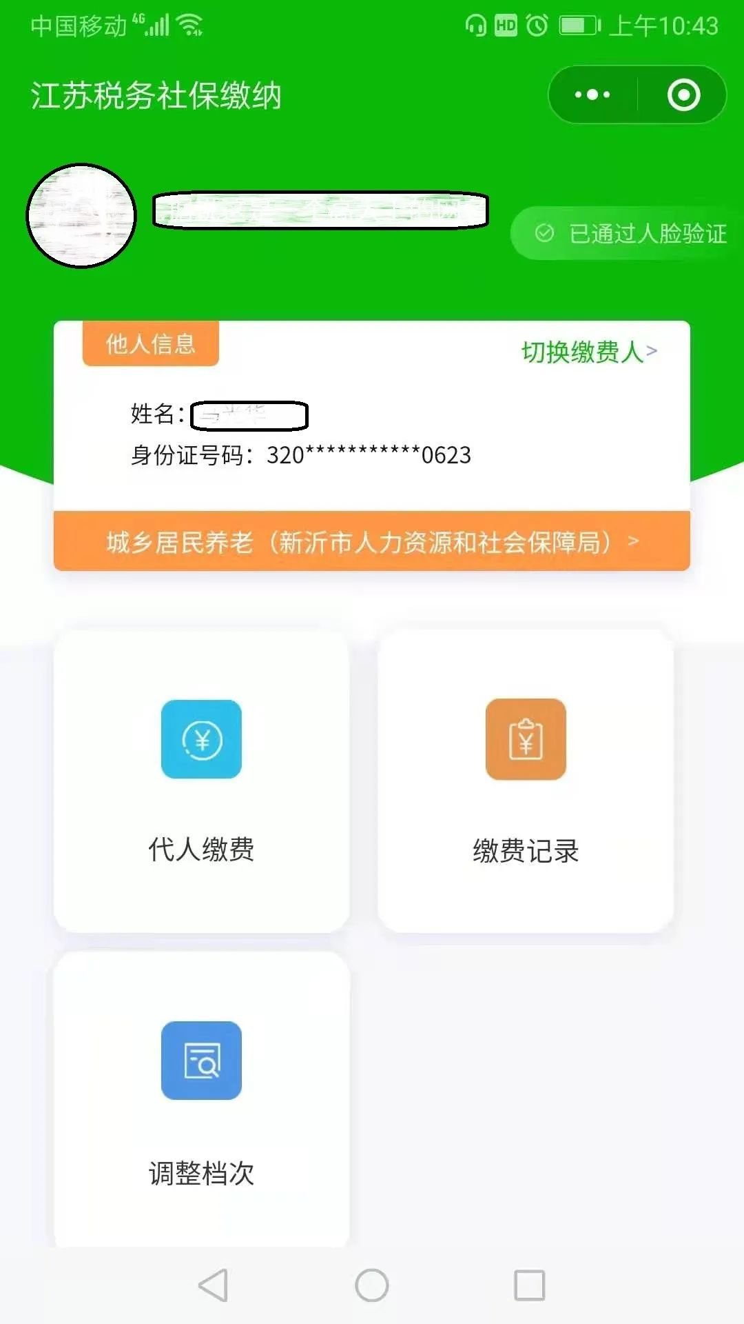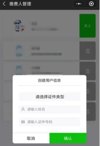 4.完成“实名认证”后,默认出现“本人”登记信息,点击“切换缴费人”(图①),“添加他人身份信息”(图②)可切换至他人身份,选择“代人缴费”(图③)为他人缴费。