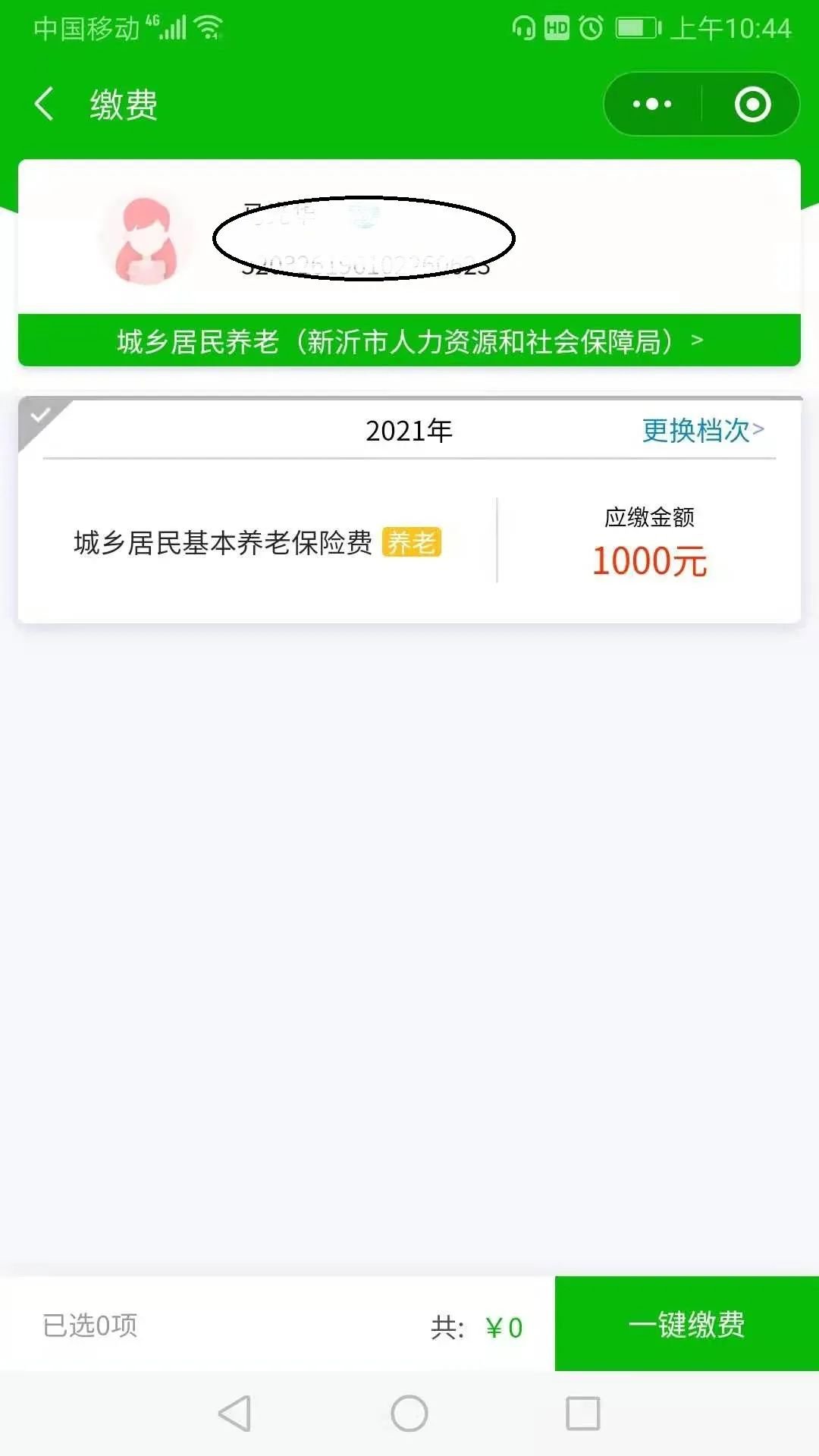 7.选择正确的缴费档次后,若系统仍显示原缴费档次。需返回首页选择“缴费”或者“代人缴费”。重新进入缴费页面后,系统显示正确的缴费档次。选中后点击“一键缴费”,即可完成城乡居民基本养老保险费的选档缴费。