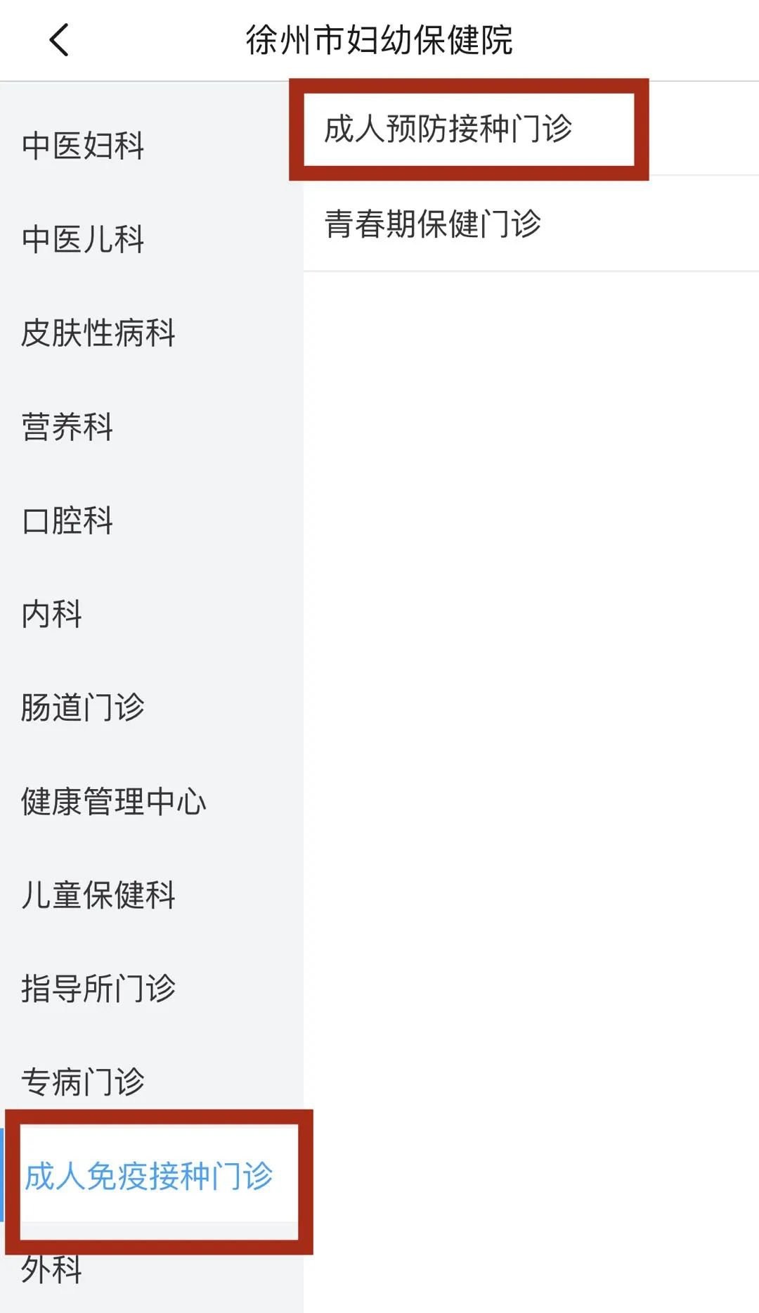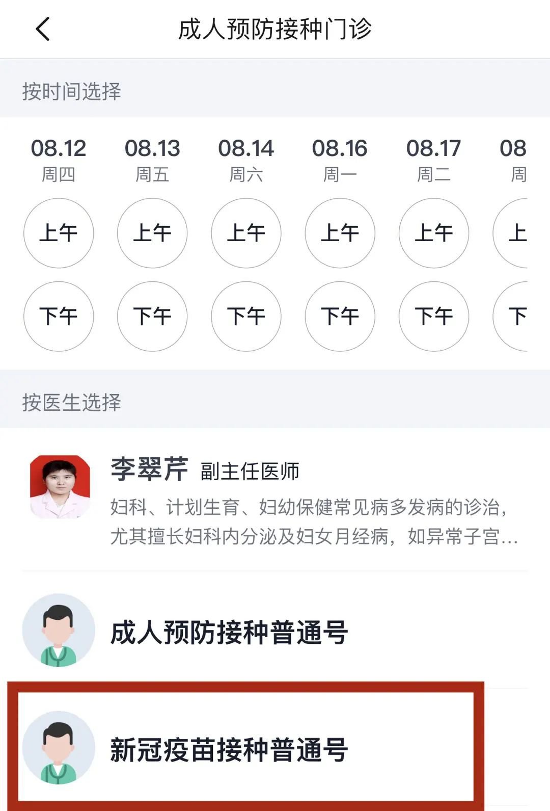 3.点击成人免疫接种门诊下的成人预防接种门诊,并选择新冠疫苗接种普通号