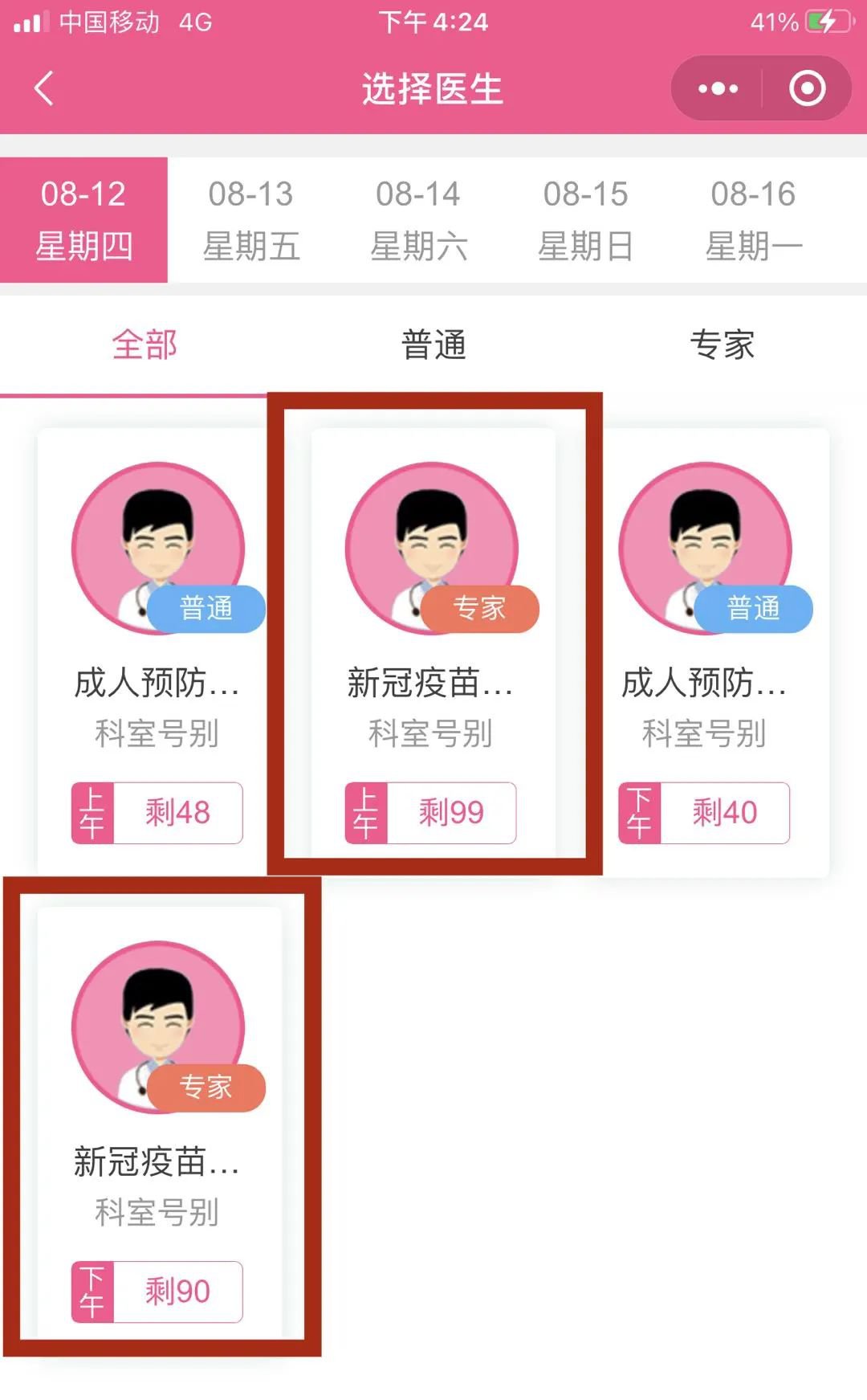 3.点击成人免疫接种门诊下的成人预防接种门诊,并选择新冠疫苗接种普通号