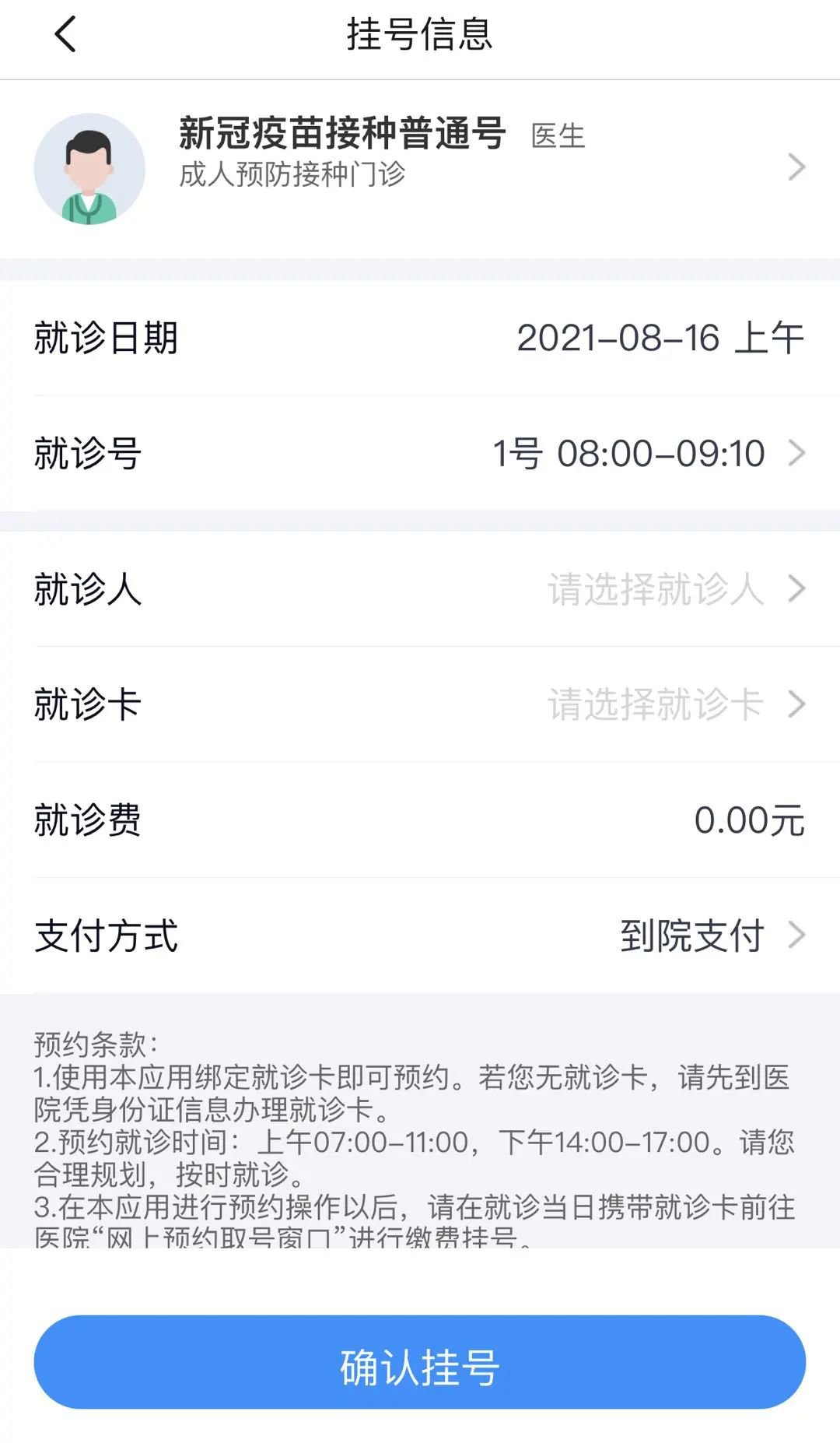 4.选择预约时间后进行挂号信息填写(按要求添加就诊人信息后,保存并选择在线办理就诊卡)