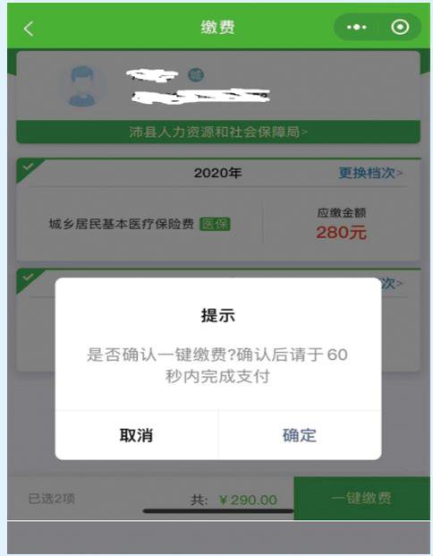 6.我们先选择城乡居民医疗保险为例,点击“缴费”或者“代人缴费”→选择缴费年度“2020年”查看缴费金额是否正确。2020年沛县城乡居民基本医疗保险费为280元,城乡居民长期护理保险10元,应合并缴纳。