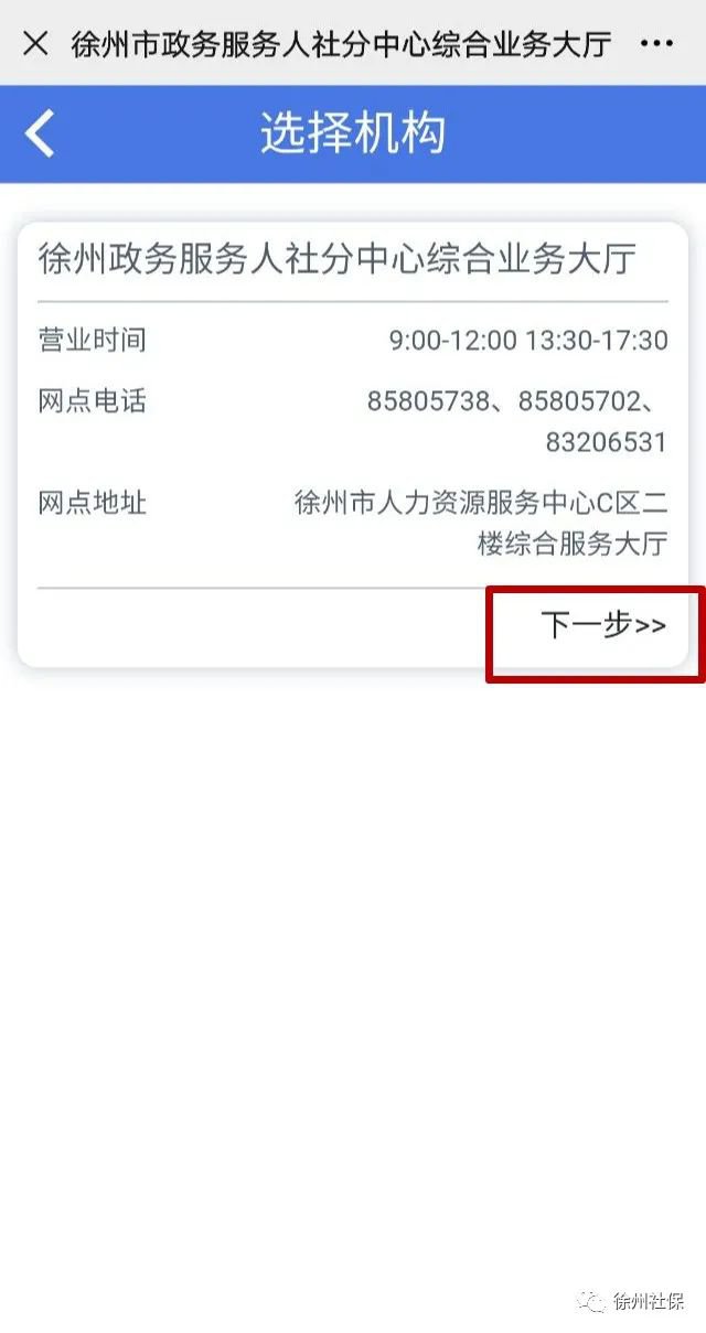 4.选择“预约取号”,进入“选择机构”页面,阅读“营业时间、网点电话、网点地址”后,点击“下一步”。