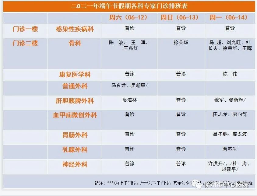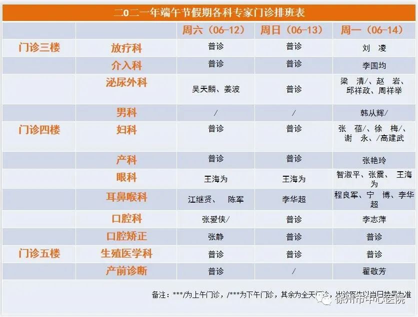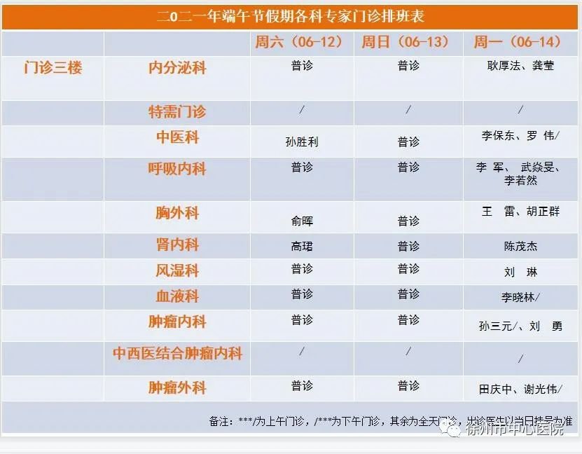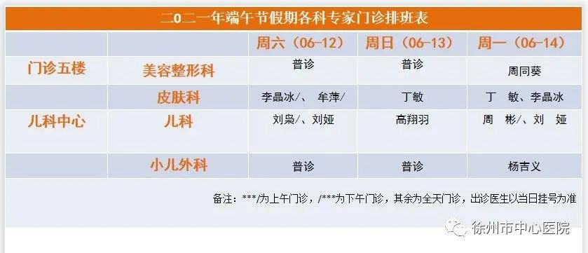 2021年“端午节放假期间,徐州市中心医院专家门诊、普通门诊均正常开放;急诊24小时接诊;医技检查科室等正常运行,为您健康保驾护航!