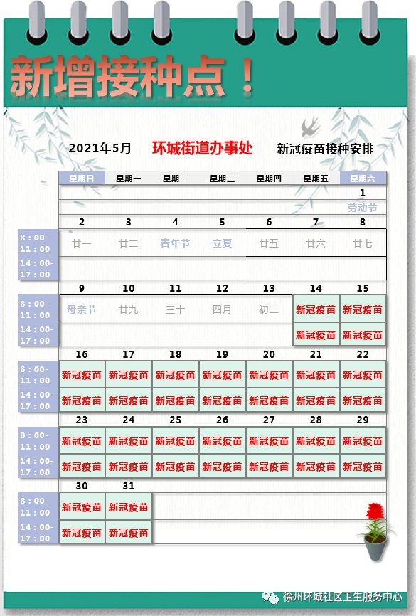 2、环城社区卫生服务中心周六、周日接种时间增加为:上午8:00-11:00及下午2:00-5:00(周一至周五保持不变)