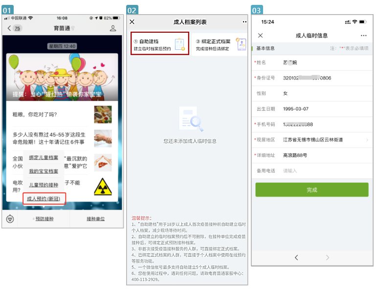 在公众号界面,点击【预防接种】——【成人预约(新冠)】,选择“1自助建档”输入相应信息后点击完成。