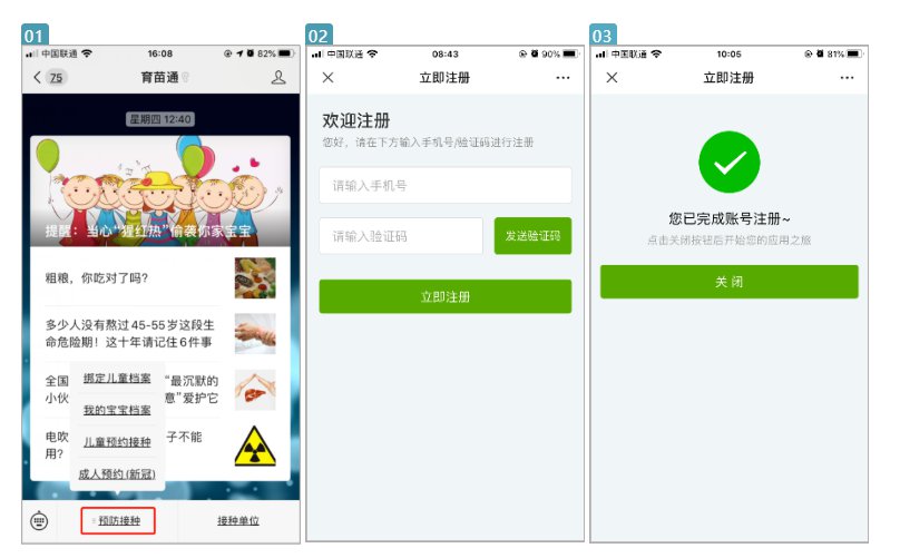 初次使用公众号,需要先完成注册,微信界面——预防接种,任一菜单都提示如图注册即可。