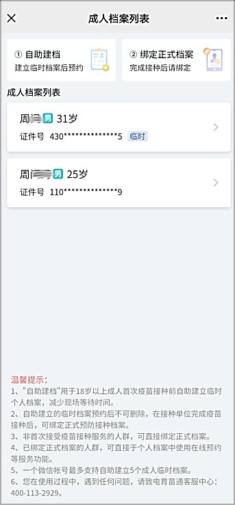在成人档案列表中选择需要预约的档案,选择“我要预约”——“确认预约”就完成了,去接种单位出示预约的二维码扫码即可。