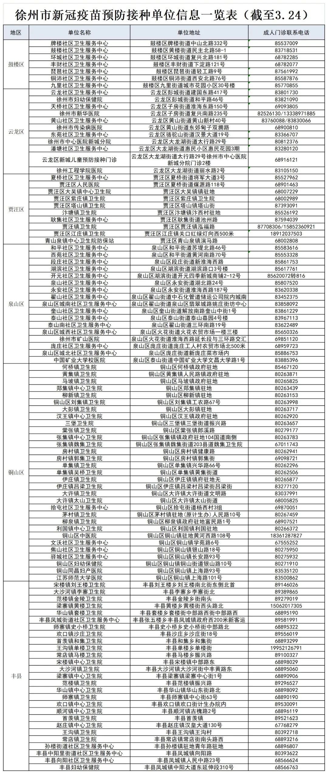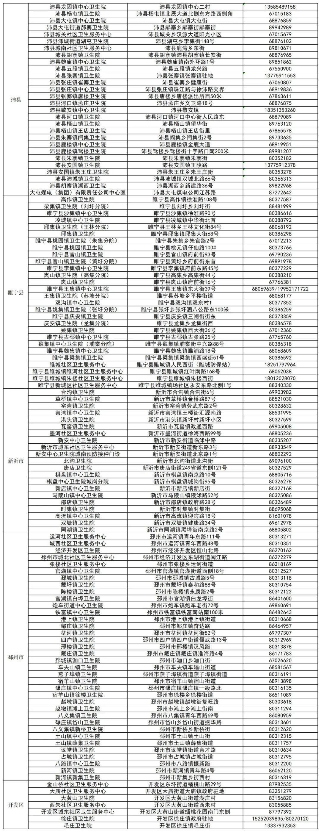 2021徐州市新冠疫苗预防接种单位信息一览表