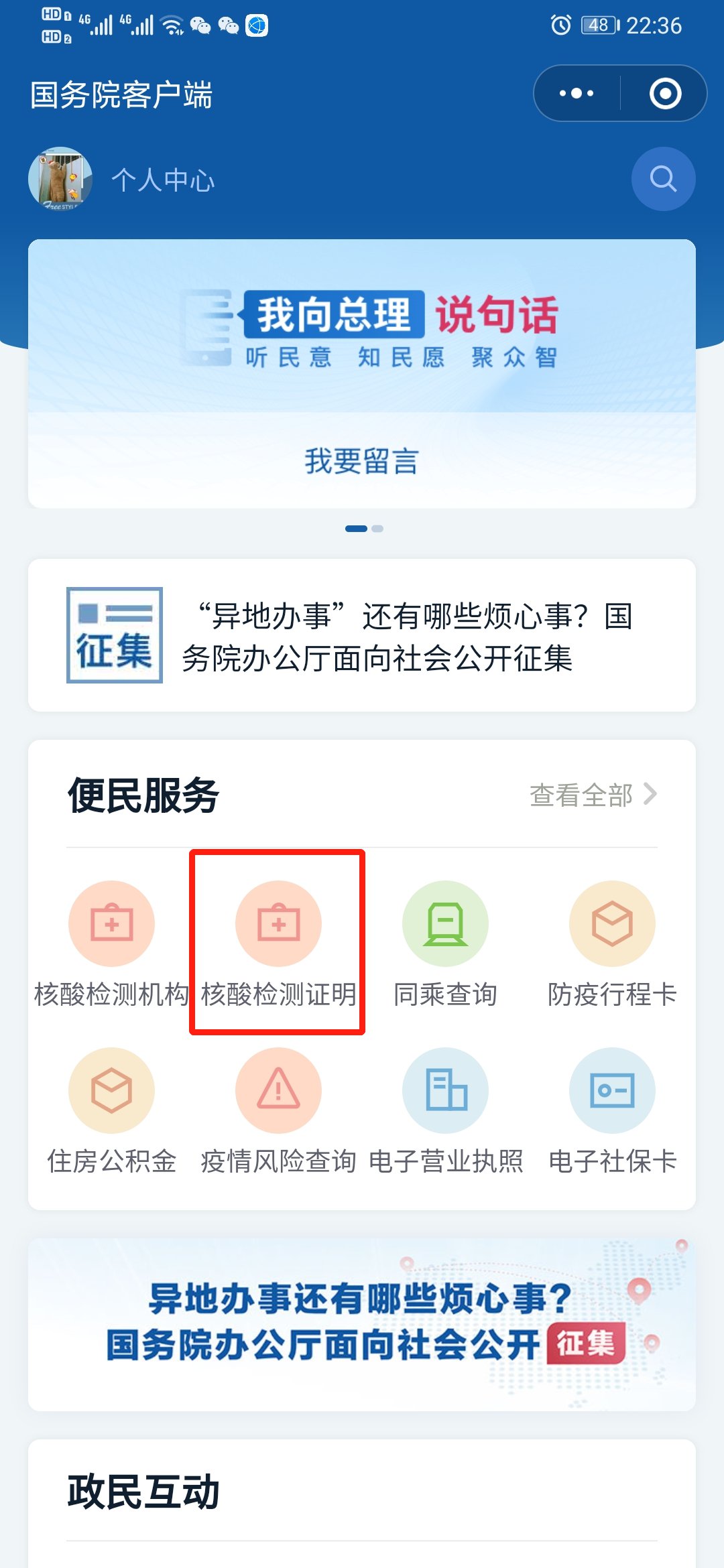 温馨提示:做完核酸检测不用去医院打印报告了,直接扫码输入姓名及身份证号,就可以快速查询核酸检测结果,或者直接点开“国务院客户端”小程序——“核酸检测”查询。