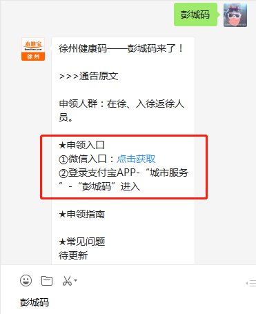 微信搜索公众号徐州本地宝 (ID:xuzbdb),关注后在对话框回复【彭城码】可查看彭城码是什么、有什么用,怎么申请、如何使用等指南。回复【苏康码】可查看苏康码是什么、有什么用,获取长三角、省内互认苏康码具体上线时间上线平台、怎么申请、如何使用等指南。