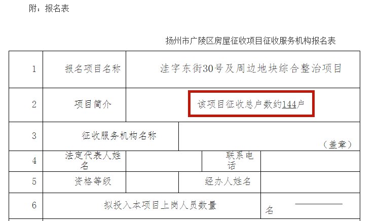 8月20日,扬州市广陵区住房和城乡建设局官网发布《扬州市广陵区房屋征收项目征收服务机构报名公告(洼字东街30号及周边地块综合整治项目)》。