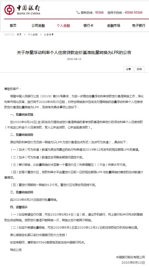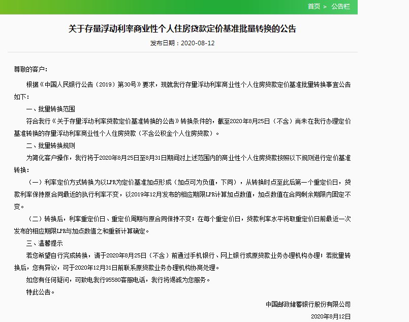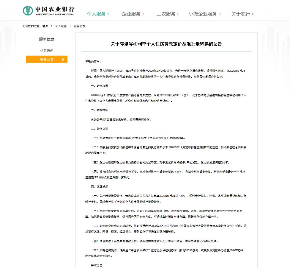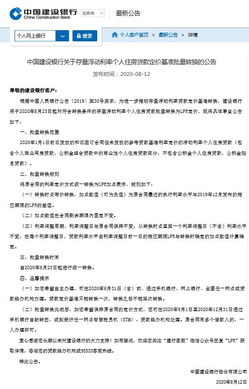 8月12日,中国工商银行、中国建设银行、中国农业银行、中国银行、中国邮政储蓄银行等五家国有大行均发布公告称,将于8月25日起,对符合转换条件但尚未办理转换的存量浮动利率个人住房贷款定价基准批量转换为LPR。