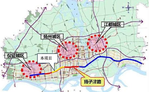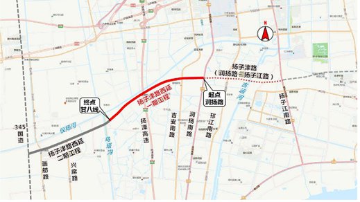 扬子津路西延一期工程建设,工程东起润扬南路,西至规划的甘八线,路线全长约4.47公里,标准断面宽63米,采用“主六辅四”建设规模,主线为快速路。