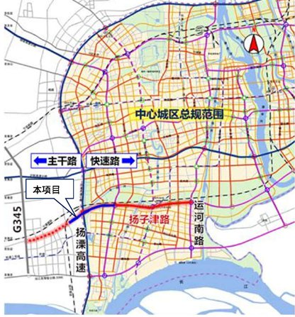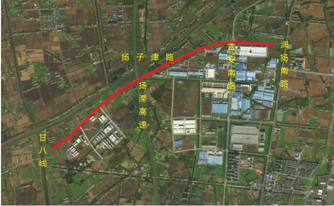 其中,甘八线到扬溧高速段为城市主干路,远期兼顾一级公路功能;扬溧高速到润扬路段采用“快速路主线+次干路辅道”建设形式。主线为城市快速路,辅道为城市次干路。
