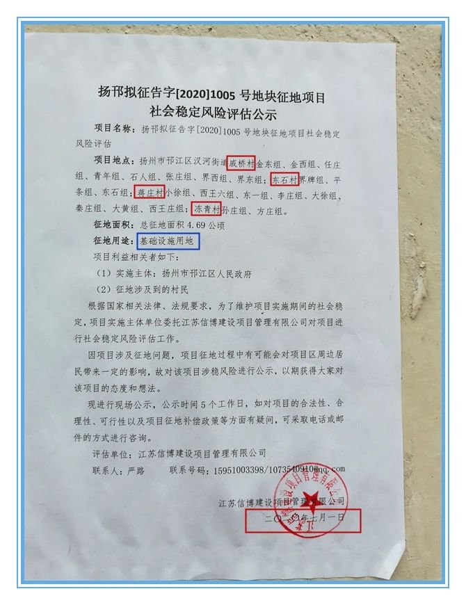 现在,《拟征告字[2020]1005号地块征地项目社会稳定风险评估公示》已经正式张贴,看来扬子津路西延一期工程开工日期真的近了!