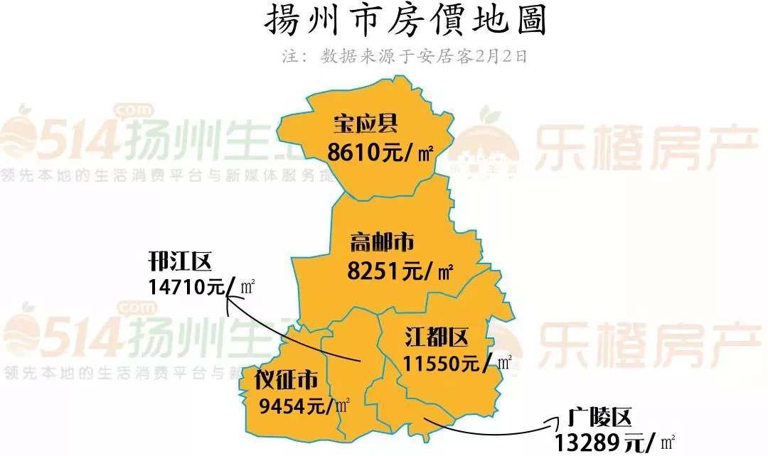 截止2020年2月2日,扬州各地区房价平均单价如图所示,分区域来看,邗江区以14710元 /㎡的均价占据榜首,广陵区以13289元/㎡紧随其后。其中,高邮市以8251元/㎡的单价相对处于价格洼地。