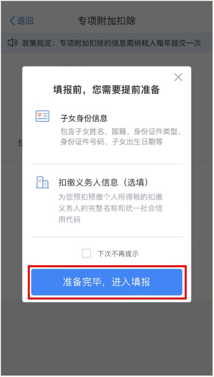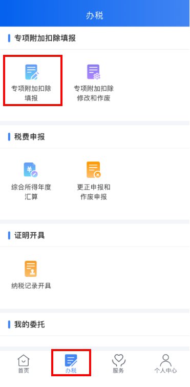 纳税人登录手机个人所得税APP后,可通过“首页——常用业务——专项附加扣除填报”或“办税——专项附加扣除填报”进入专项附加扣除填报界面,并选择“婴幼儿照护费用”专项附加扣除。