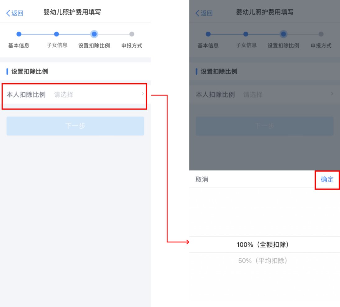 完成子女信息填写后,纳税人根据实际情况在“本人扣除比例”中选择100%(全额扣除)或50%(平均扣除)其中一种。选择完成并确定后,点击“下一步”。
