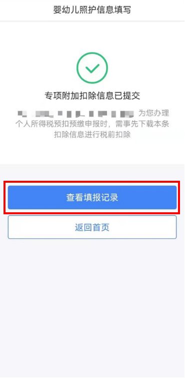 设置扣除比例后,进入“申报方式”界面,纳税人可根据实际情况选择“通过扣缴义务人申报”或“综合所得年度自行申报”任意一种方式。如果纳税人需要在每月发放工资薪金时享受专项附加扣除,需要选择“通过扣缴义务人申报”,并核实扣缴义务人信息是否准确。选择完成后,点击“提交”,即完成3岁以下婴幼儿照护专项附加扣除填报流程,系统将弹出“专项附加扣除信息已提交”的提示。纳税人可以点击“查看填报记录”查看已经申报的专项附加扣除信息。