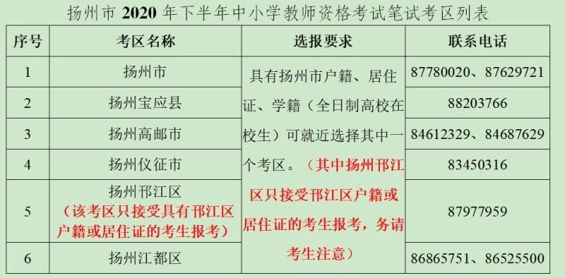 为平稳顺利完成教师资格考试工作,按疫情防控常态化的要求减少人员聚集和流动,方便考生在当地就近报名、考试,从2020年下半年起扬州市笔试分设6个考区,如下表所列。选择扬州6个考区之一的,必须满足以下三项条件之一: