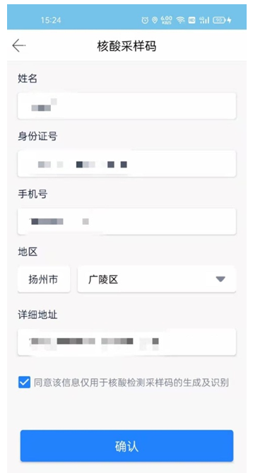 填写当前居住地址并确认所填信息无误后点击“确认”,获取“核酸采样码”。