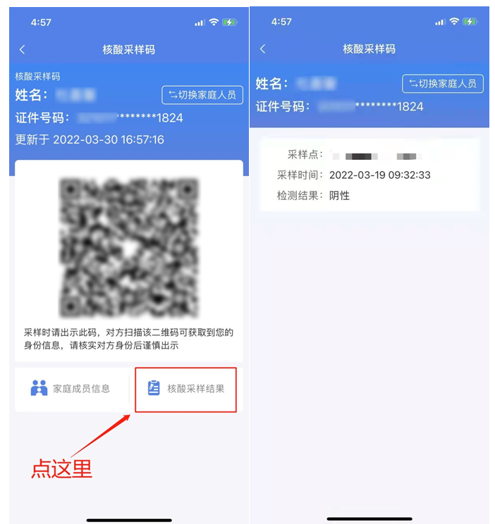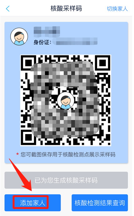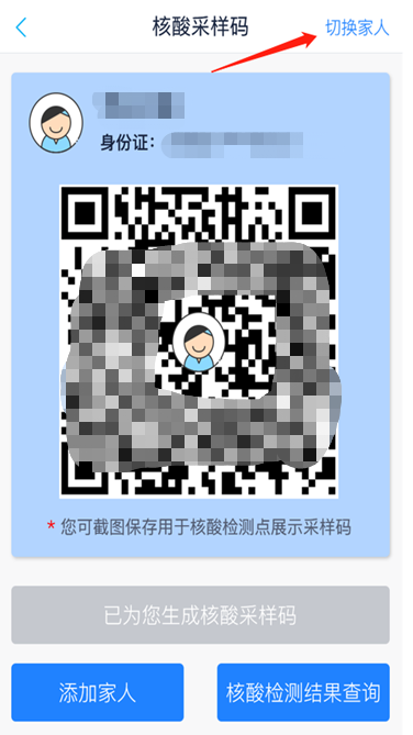 添加家人信息后,可在“核酸采样码”主页点击“切换家人”,可查看家人核酸采样码,可用手机截图保存。