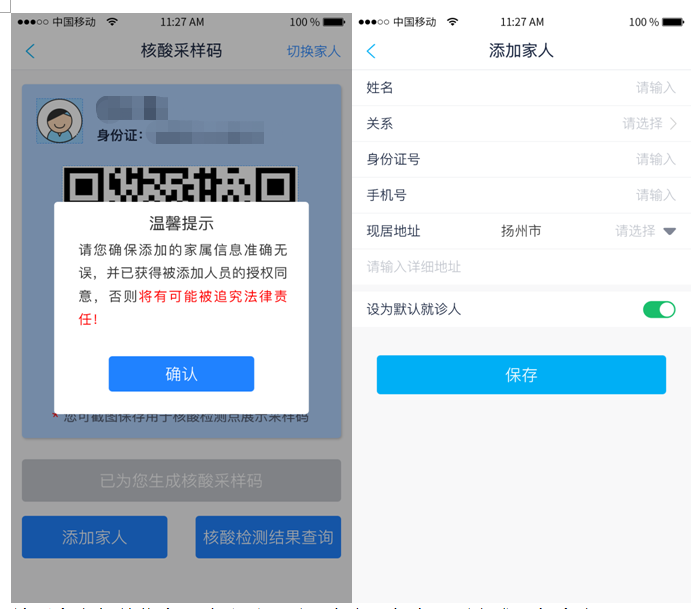 在核酸采样码页面,点击“添加家人”,进入添加家人页面