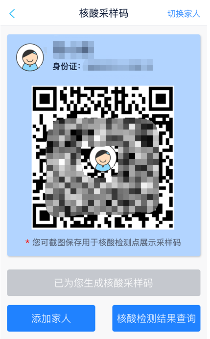 添加家人信息后,可在“核酸采样码”主页点击“切换家人”,可查看家人核酸采样码,可用手机截图保存。