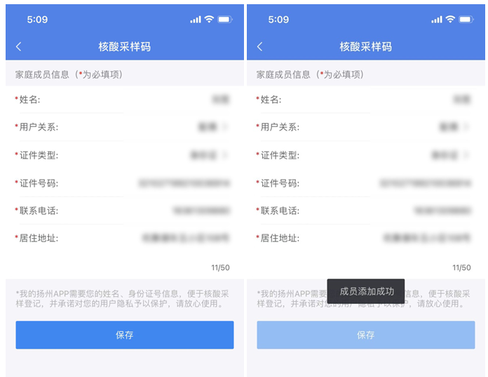 “核酸采样码”主页点击“家庭成员信息”进入页面,可修改已填写信息,或添加家庭成员信息。