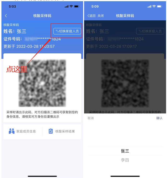 “核酸采样码”主页点击“切换家庭人员”,切换家庭成员,获取该成员“核酸采样码”,可用手机截图保存。