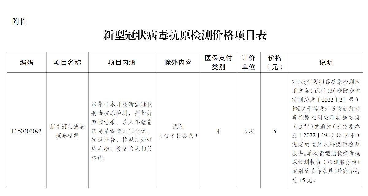 一、临时新增公立医疗机构新型冠状病毒抗原检测(编码L 250403093)价格项目(见附件)。采取技耗分离方式,按照“检测价格项目+检测试剂”收费,其中,检测项目指导价格为5元/人次,不得上浮。抗原检测试剂盒(含采样器具,国家医保医用耗材分类与代码前15位为:C14020227700024),公立医疗机构按“零差率”销售。