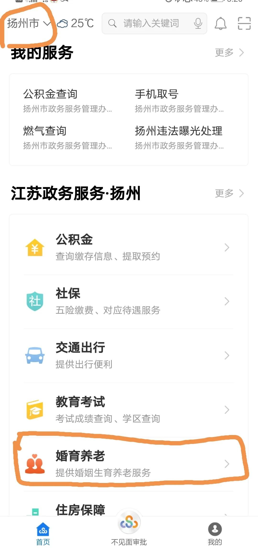 第二步:进入江苏政务APP,左上角选择“扬州市”,然后点击【婚育养老】