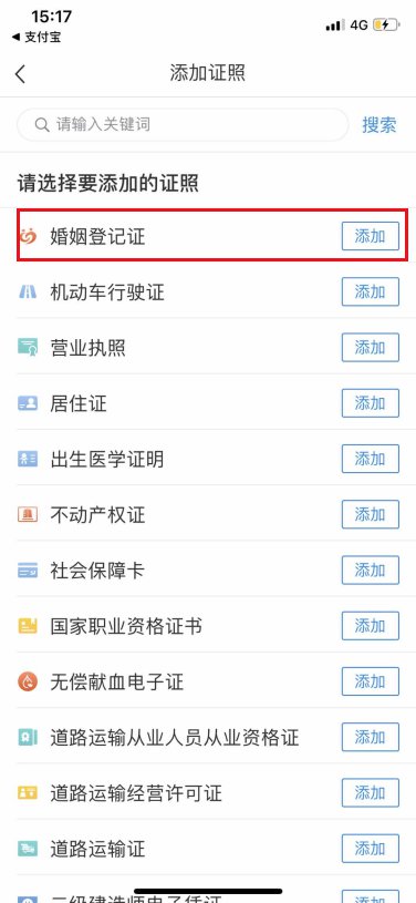 点击添加婚姻登记证即可申领↓