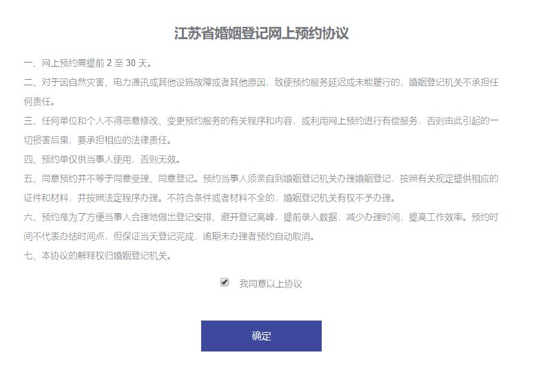 3、阅读江苏省婚姻登记网上预约协议,并勾选我同意以上协议,点击确定。