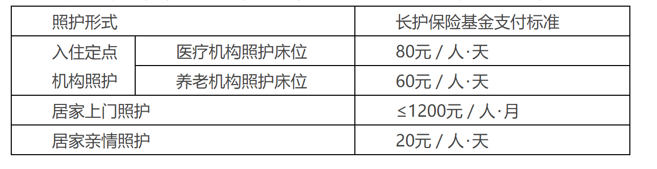 符合保障范围和待遇享受条件的长期护理费用,不设起付线,根据不同的照护行式、服务项目及内容,由长护保险基金按以下标准支付: