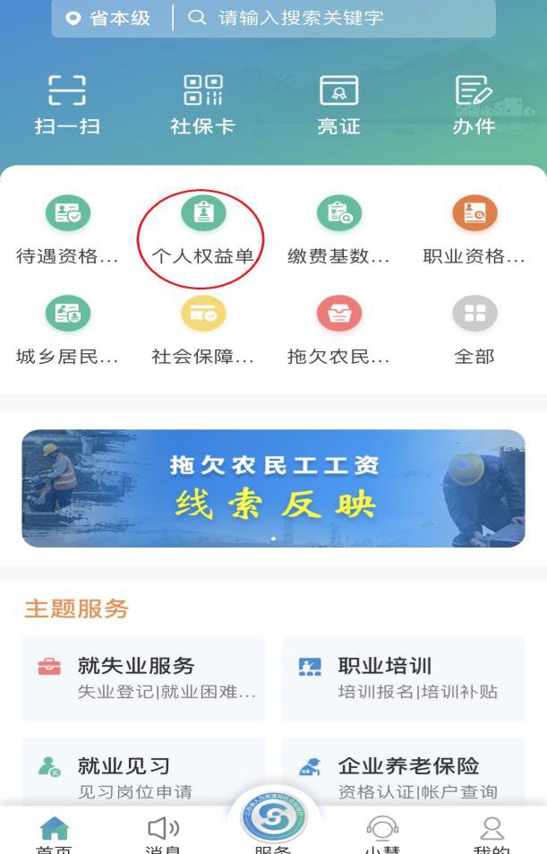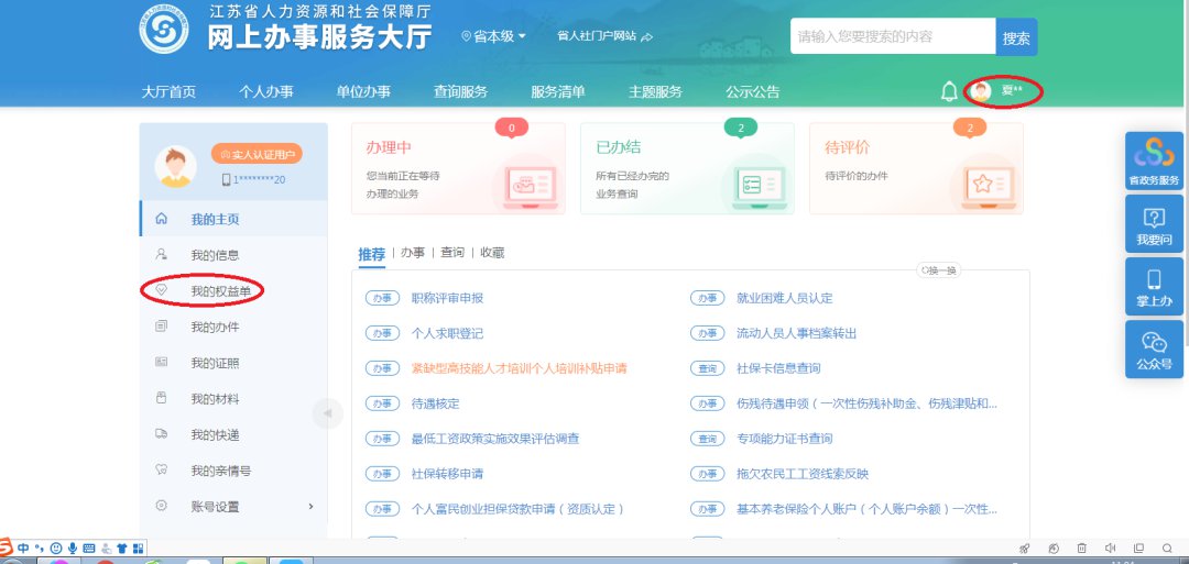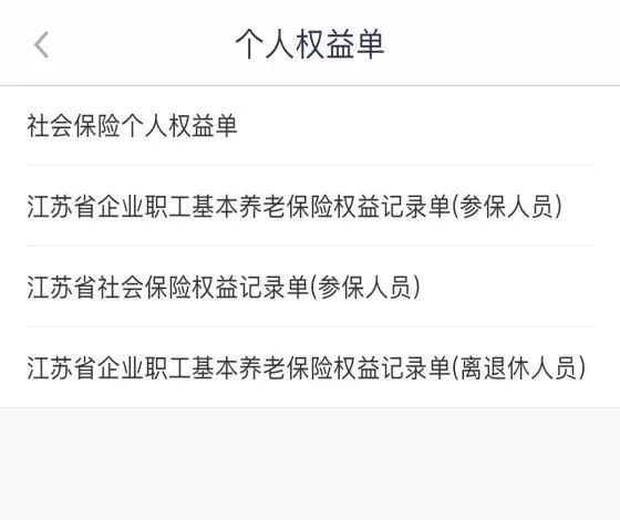 注册并且实名认证江苏智慧人社app进入主页,点击【个人权益单】一栏,展开四种“个人权益单”,可自行选择打印。